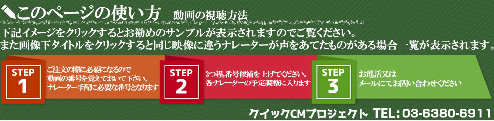新着順で表示されています。ナレーション/企業/CM等向けサンプルとしてご視聴ください。